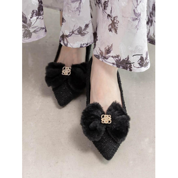シーズンムード高まるファーリボンパーツ付きのパンプス。