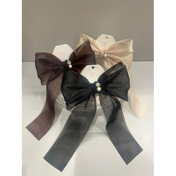 オーガンジー素材にさりげないストライプが入っていて、綺麗めな服装にもぴったりなフックポニーとなっております!真ん中にビジューが付いていてより華やかな印象を与えてくれる商品です♪