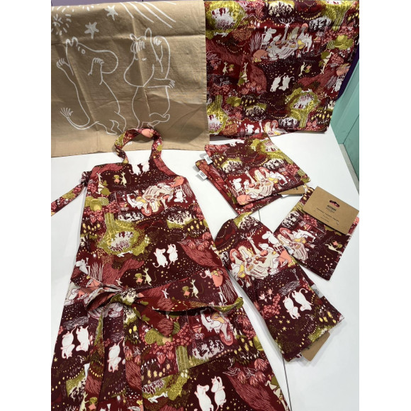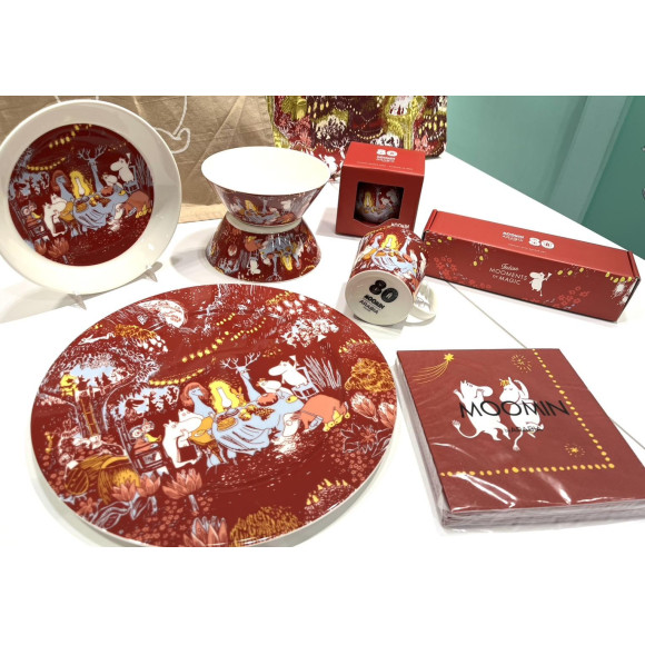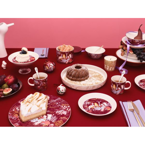 1948年の『たのしいムーミン一家』をもとに、ムーミン アラビアのデザインチームのパルバティ・ピライによってデザインされたこのコレクションは、ボルドーカラーをベースに、淡い赤や温かみのあるイエロー、淡いブルーをアクセントにした豊かな色調で、ムーミン谷の祝祭の雰囲気を印象的に表現しています。ホリデーシーズンにふさわしい世界観で、贈り物としても自宅での特別なひとときを彩るアイテムとしても、ぴったりなコレクションです。