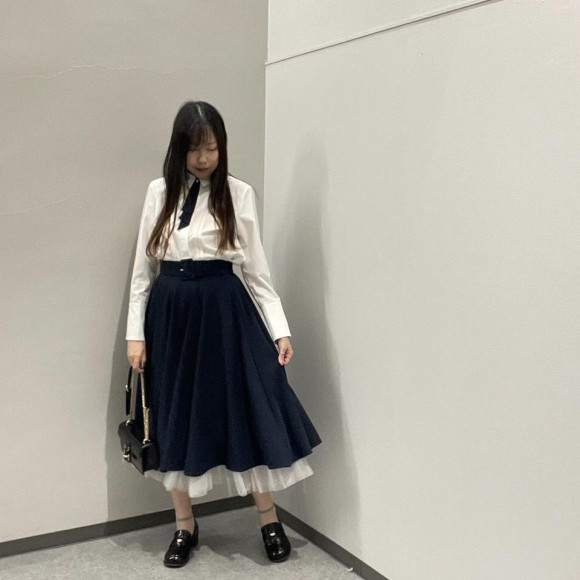 ボトムはシンプルに無地のサーキュラーフレアスカートを、ジャケットでカチッとした雰囲気にしてオフィスにも使えるスタイリングをを意識してみました♩