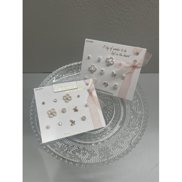 6ペアセットのビジューとパールが煌めくピアスです!台紙にリボンが付いていてプレゼントにもぴったりの商品となっております♪