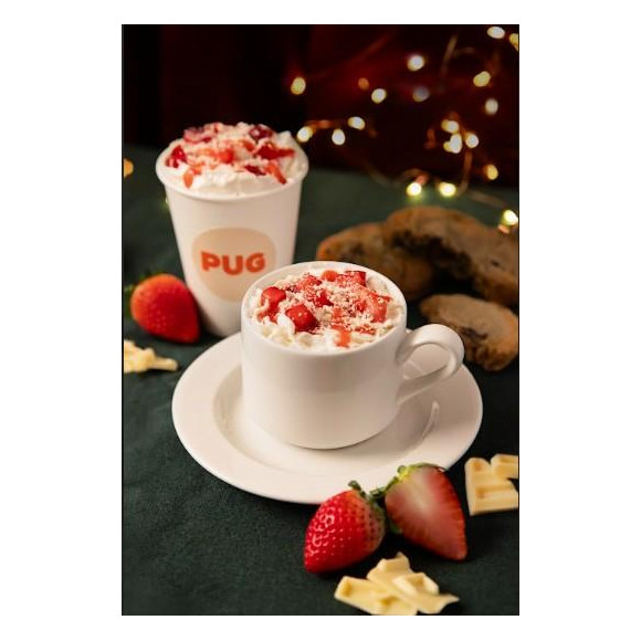 冬に楽しみたいホワイトチョコとストロベリーの優しいハーモニー。なめらかな甘さにほんのり酸味を添えたこの季節だけの特別な一杯。ストロベリーダイスを添えたホイップクリームで見た目も味わいも贅沢に!クッキーと一緒に冬のひと時をお楽しみください。680円(税込み)