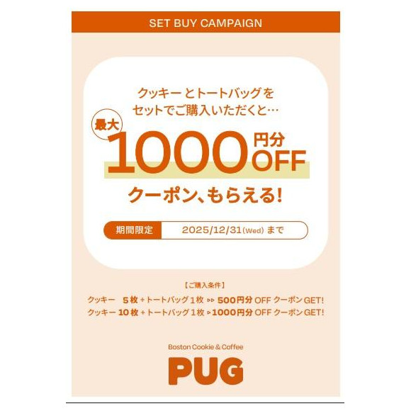 PUG オリジナルトートバック(全2種)¥890とクッキーBOXを同時購入で最大1000円OFFクーポンプレゼント!
