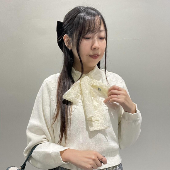 中に合わせたブラウスはF i.n.tのレースボウタイですが衿とリボンがとても柔らかいレースなので結びやすく、またふわっと結び下ろしたリボンが上品な雰囲気になるのでangelusの雰囲気にもよく合います♪(合わせたBAG,スカートもangelusのオリプリです♥)