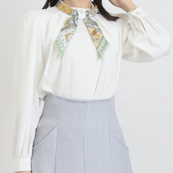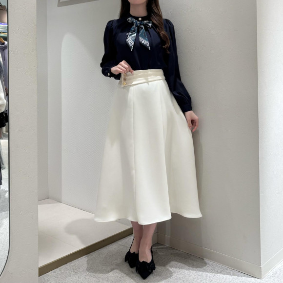 本日は、昨年人気だったスカーフ付きブラウスがリニューアルして入荷いたしましたので、おすすめの通勤コーデをご紹介いたします♪