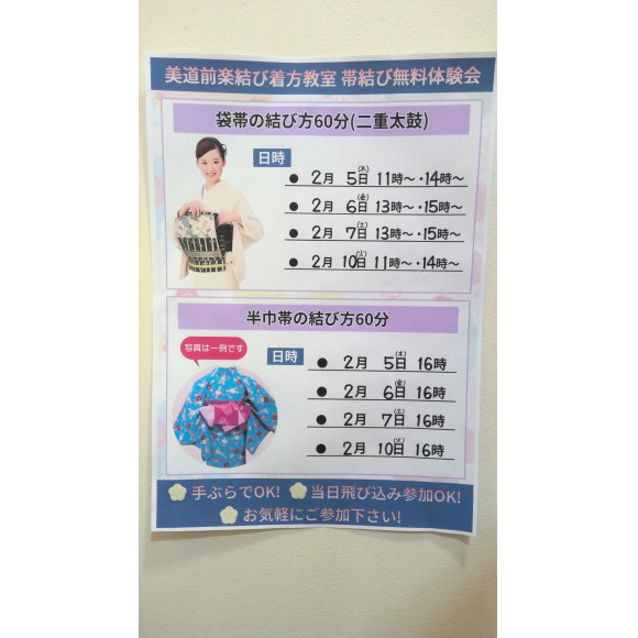 それと昨年から要望の多かった『半巾帯の結び方』も無料体験会として開催してますので、そちらも是非ともお試しくださいませ。