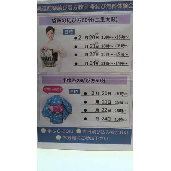 前楽結び着方教室 2月後半の帯結び無料体験会のスケジュール
