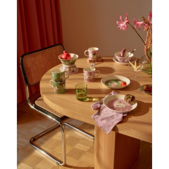 コレクションのメインカラーには、パステル調のライラックとピンクを採用。ムーミンやスノークのおじょうさんをはじめ、花や太陽、木々をモチーフにしたイラストがあしらわれています。