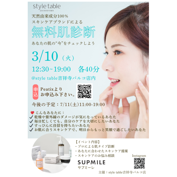 【3/10(火)無料肌診断のご案内】style table吉祥寺パルコ店
