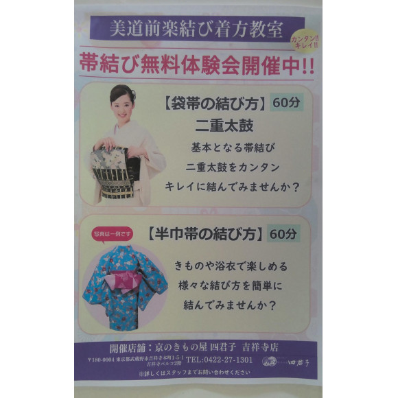 さて四君子では、「前楽結び着方教室の無料体験会」・「半巾帯の結び方無料体験会」を
